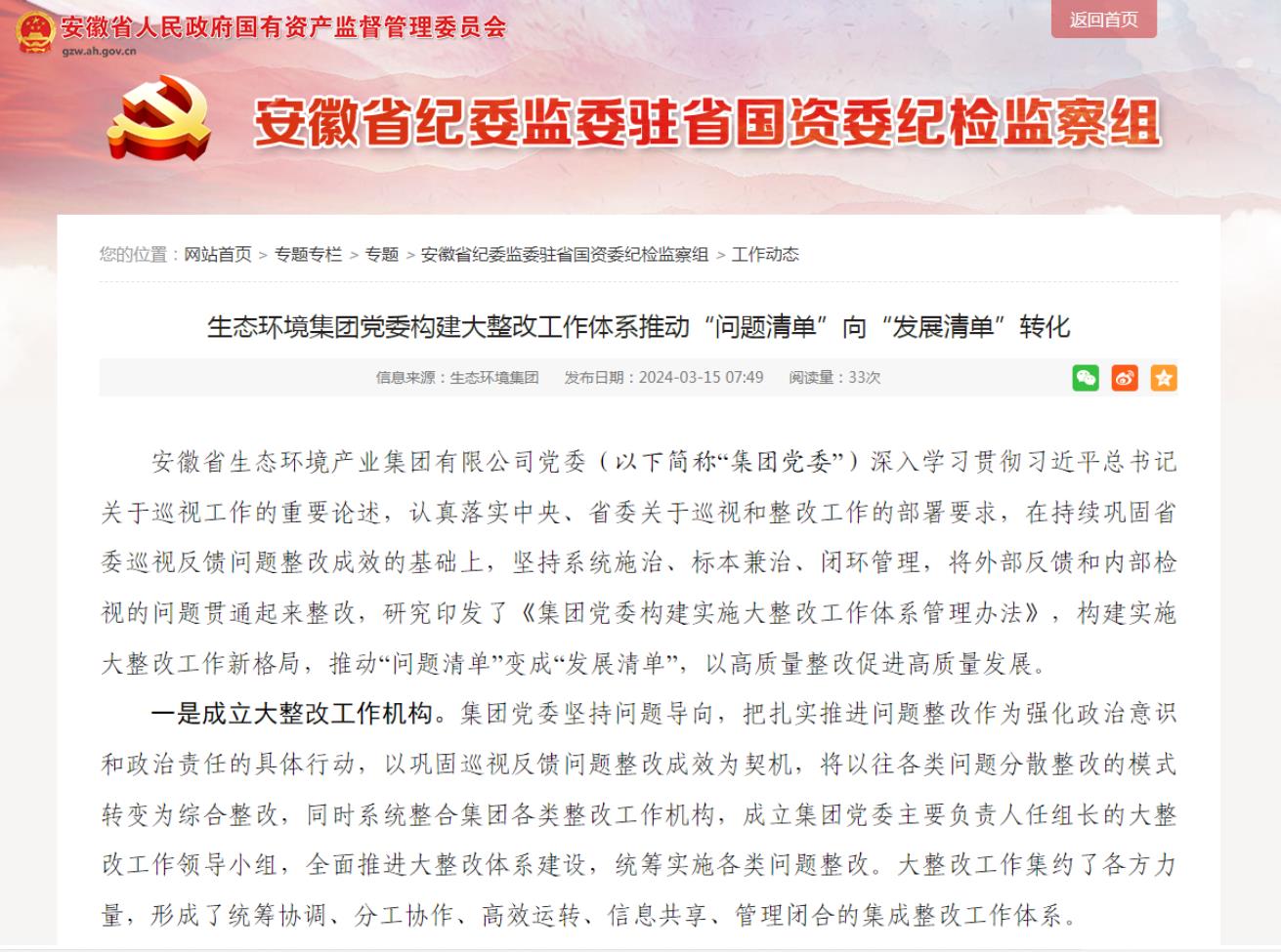 近日,安徽省國資委網(wǎng)站-安徽省紀(jì)委監(jiān)委駐省國資委紀(jì)檢監(jiān)督組專欄發(fā)布了《省生態(tài)環(huán)境集團黨委構(gòu)建大整改工作體系推動“問題清單”向“發(fā)展清單”轉(zhuǎn)化》,以下為全文。