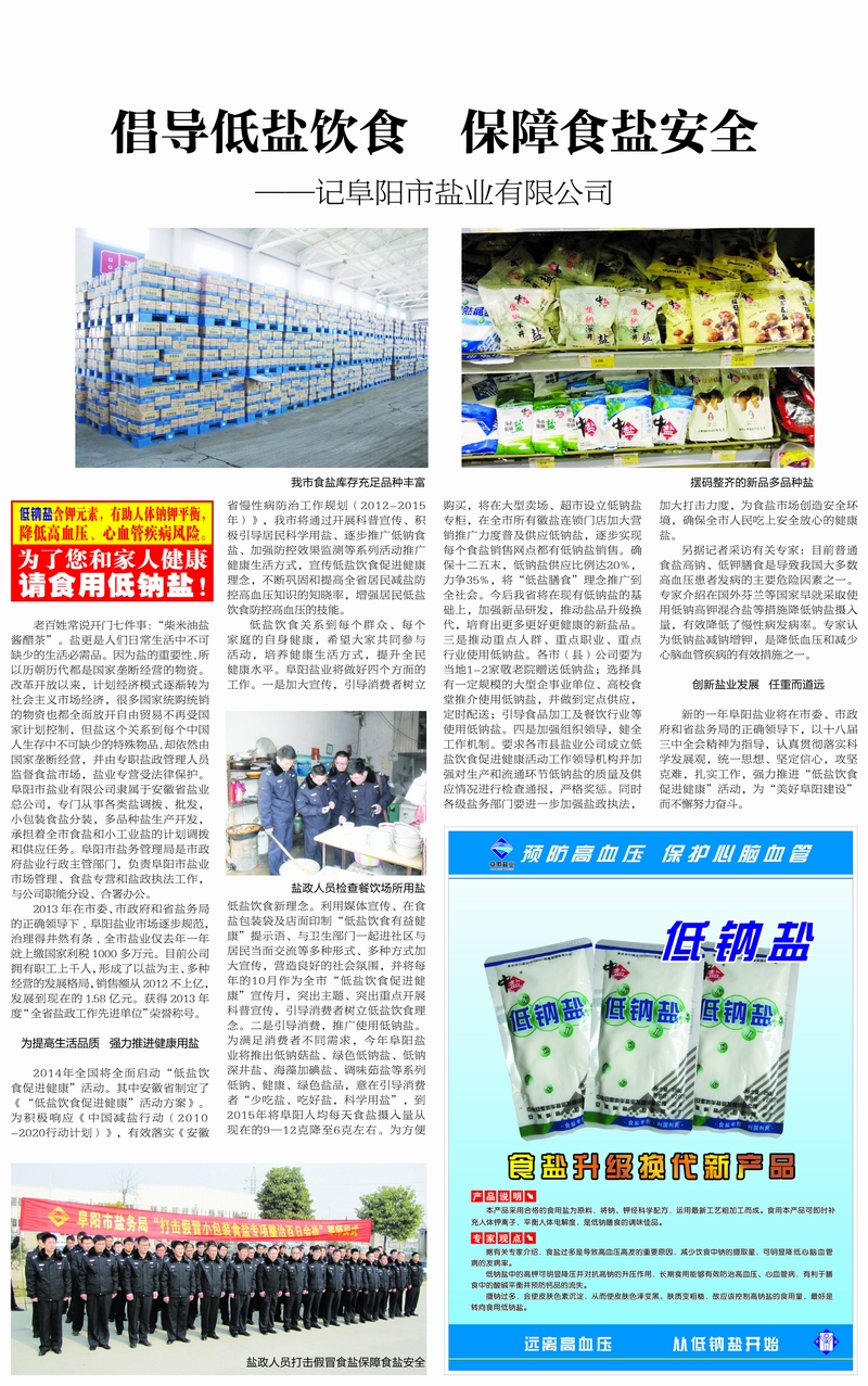 低鹽飲食關系到每個群眾、每個家庭的自身健康,希望大家共同參與活動,培養(yǎng)健康生活方式,提升全民健康水平。阜陽鹽業(yè)將做好四個方面的工作。一是加大宣傳,引導消費者樹立低鹽飲食新理念。利用媒體宣傳、在食鹽包裝袋及店面印制“低鹽飲食有益健康”提示語、與衛(wèi)生部門一起進社區(qū)與居民當面交流等多種形式、多種方式加大宣傳,營造良好的社會氛圍,并將每年的10月作為全市“低鹽飲食促進健康”宣傳月,突出主題、突出重點開展科普宣傳,引導消費者樹立低鹽飲食理念。二是引導消費,推廣使用低鈉鹽。為滿足消費者不同需求,今年阜陽鹽業(yè)將推出低鈉菇鹽、綠色低鈉鹽、低鈉深井鹽、海藻加碘鹽、調味菇鹽等系列低鈉、健康、綠色鹽品,意在引導消費者“少吃鹽、吃好鹽,科學用鹽”,到2015年將阜陽人均每天食鹽攝入量從現(xiàn)在的9—12克降至6克左右。為方便購買,將在大型賣場、超市設立低鈉鹽專柜,在全市所有徽鹽連鎖門店加大營銷推廣力度普及供應低鈉鹽,逐步實現(xiàn)每個食鹽銷售網點都有低鈉鹽銷售。確保十二五末,低鈉鹽供應比例達20%,力爭35%,將“低鹽膳食”理念推廣到全社會。今后我市將在現(xiàn)有低鈉鹽的基礎上,加強新品研發(fā),推動鹽品升級換代,培育出更多更好更健康的新鹽品。三是推動重點人群、重點職業(yè)、重點行業(yè)使用低鈉鹽。各市(縣)公司要為當?shù)?-2家敬老院贈送低鈉鹽;選擇具有一定規(guī)模的大型企事業(yè)單位、高校食堂推介使用低鈉鹽,并做到定點供應,定時配送;引導食品加工及餐飲行業(yè)等使用低鈉鹽。四是加強組織領導,健全工作機制。要求各市(縣)鹽業(yè)公司成立低鹽飲食促進健康活動工作領導機構并加強對生產和流通環(huán)節(jié)低鈉鹽的質量及供應情況進行檢查通報,嚴格獎懲。同時各級鹽務部門要進一步加強鹽政執(zhí)法,加大打擊力度,為食鹽市場創(chuàng)造安全環(huán)境,確保全市人民吃上安全放心的健康鹽。