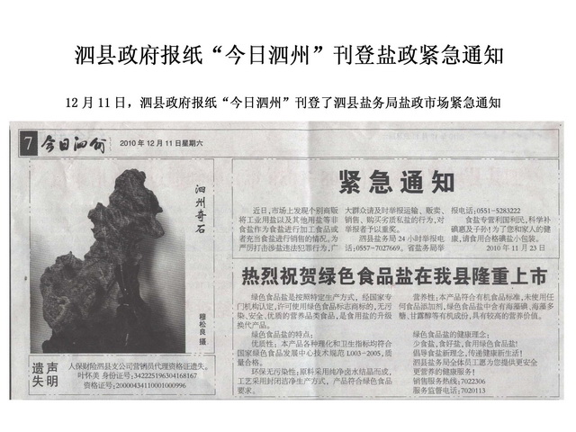 《今日泗州》刊登泗縣鹽務(wù)局鹽政市場(chǎng)緊急通知