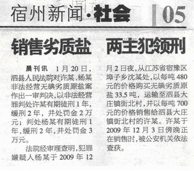 《皖北晨刊》:銷售劣質鹽 兩主犯領刑