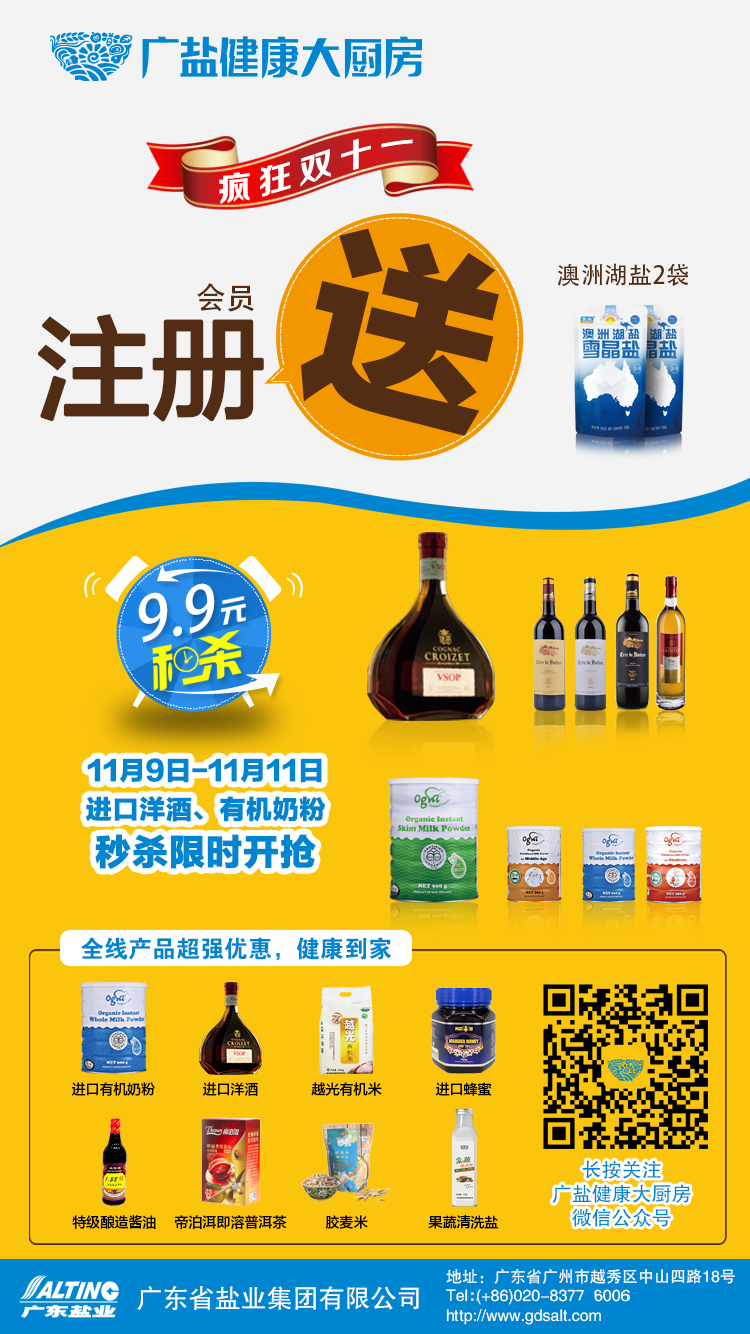 廣東省鹽業(yè)集團(tuán)在11月組織開展全省統(tǒng)一的廣鹽健康大廚房“雙11” 營銷活動。活動期間,用戶關(guān)注“廣鹽健康大廚房”微信公眾號(微信號:gyjkdcf)并注冊為會員的,每人均可免費(fèi)獲贈兩包澳洲湖鹽(250g),另外還有多款商品限時“9.9元秒殺”及全場打折優(yōu)惠活動,活動詳情及參與方式請大家關(guān)注廣鹽健康大廚房。